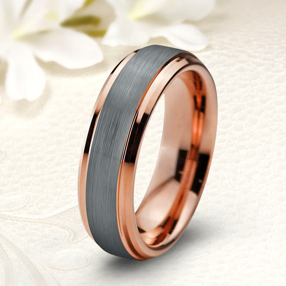 Szélein valódi rozé arannyal bevont modern fazonú, tungsten karbid (volfram) anyagú uniszex karikagyűrű. Az arany rész fényesre polírozott, a középső grafitszürke rész matt felületű.
